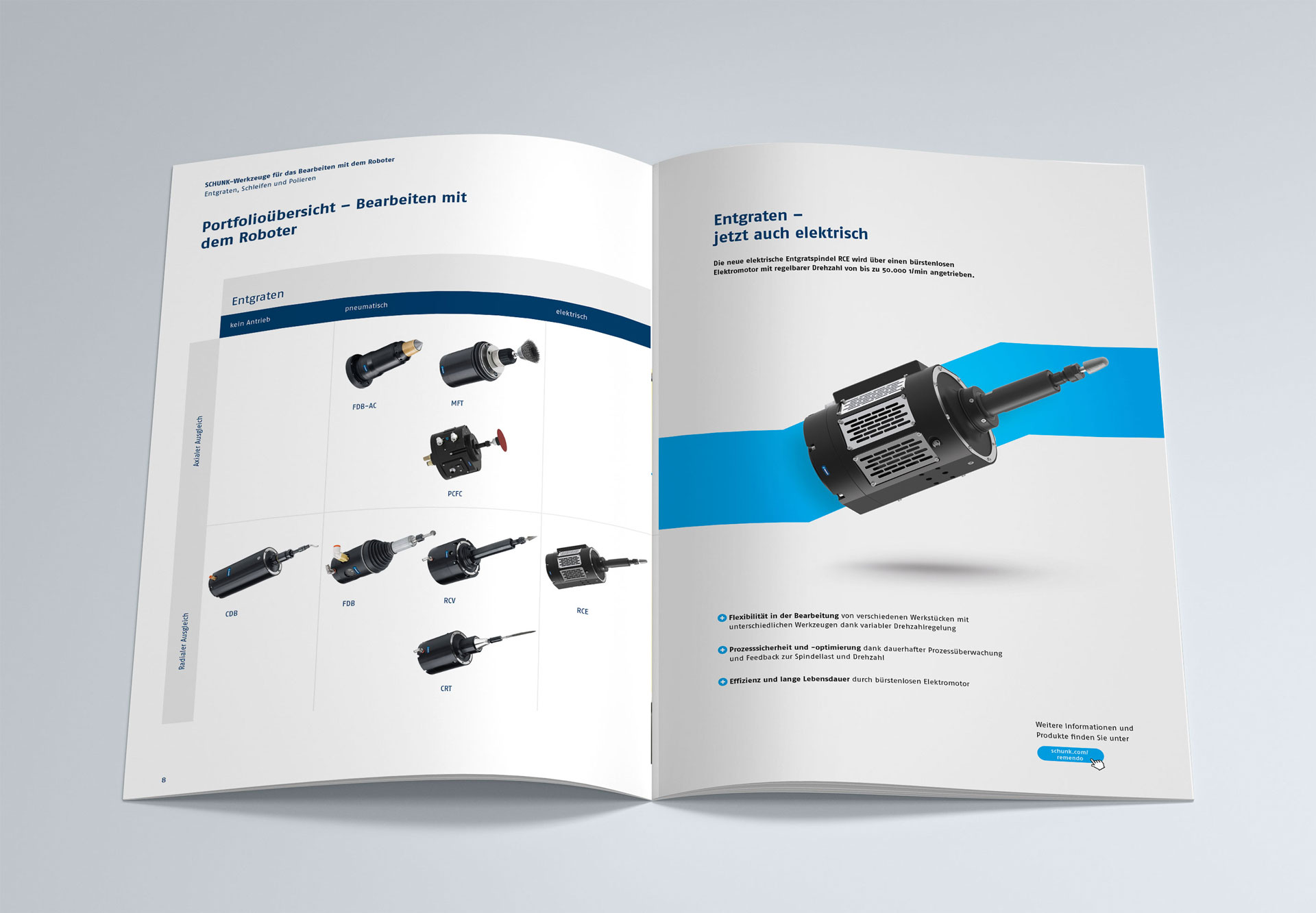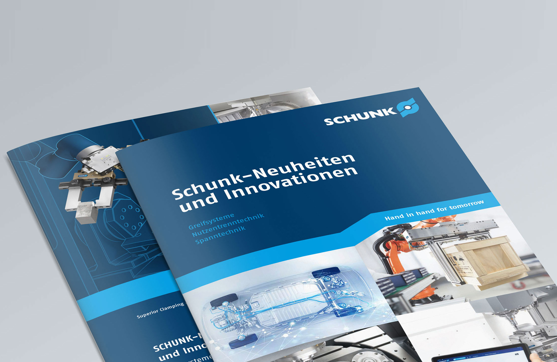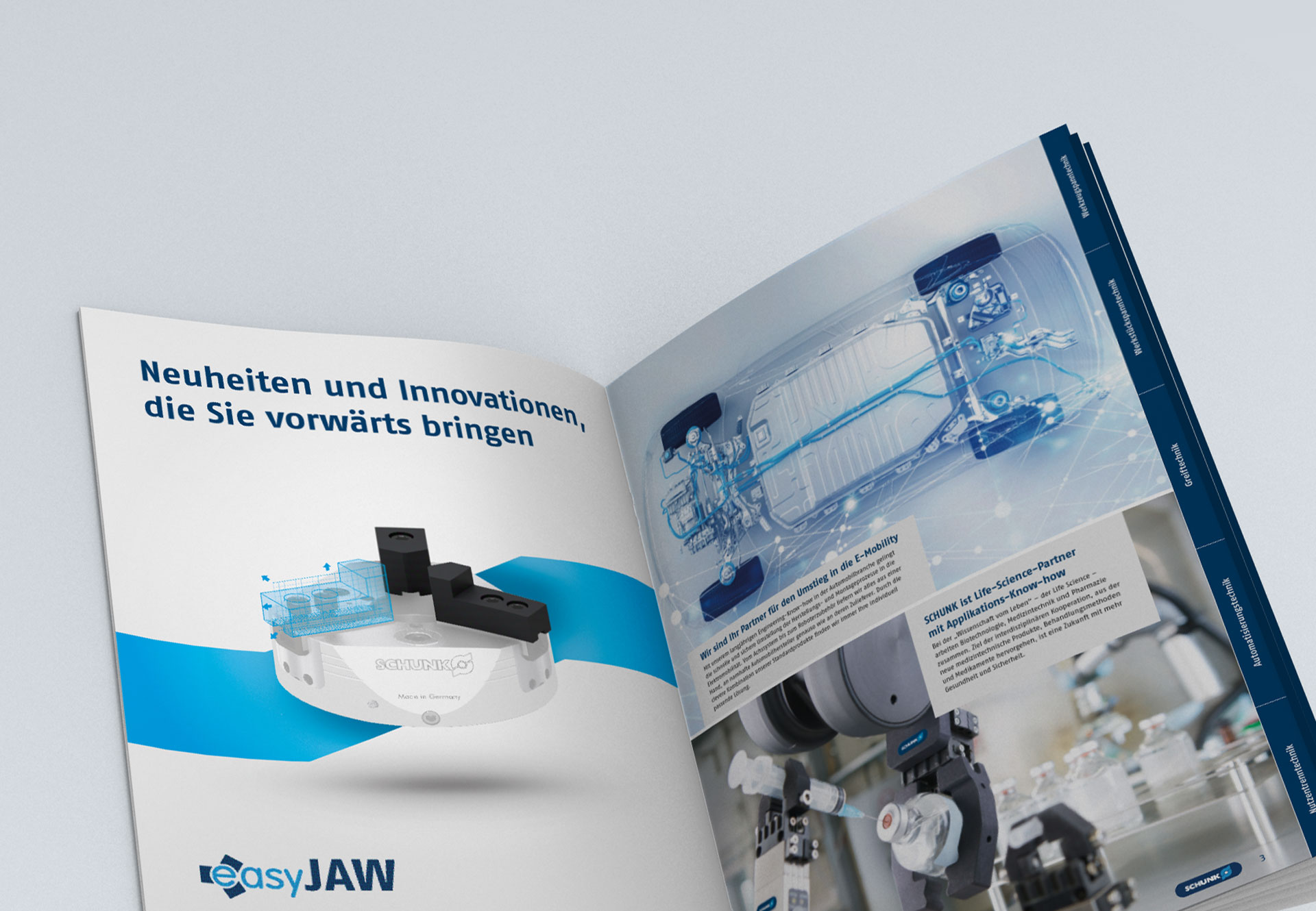 Im Rahmen eines Corporate Design „Facelift“ bei SCHUNK haben wir die gestalterische Überarbeitung der halbjährlich aufgelegten Broschüre „SCHUNK-Neuheiten und Innovationen“ realisiert. Neue Designelemente, Linien, Grafiken, Icons und Tabellen bringen die technische Produktwelt in der rund 60-seitigen geprinteten Neuheiten-Präsentation in einem neuen Erscheinungsbild zusammen.
