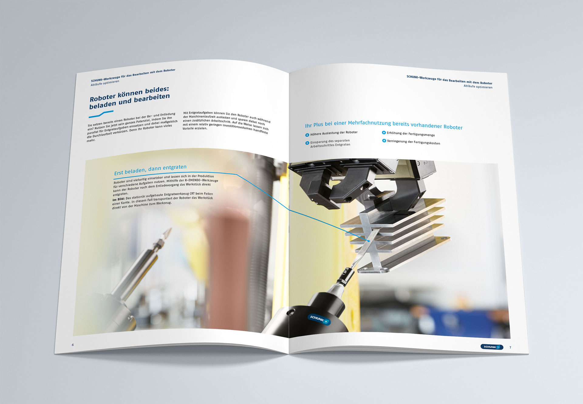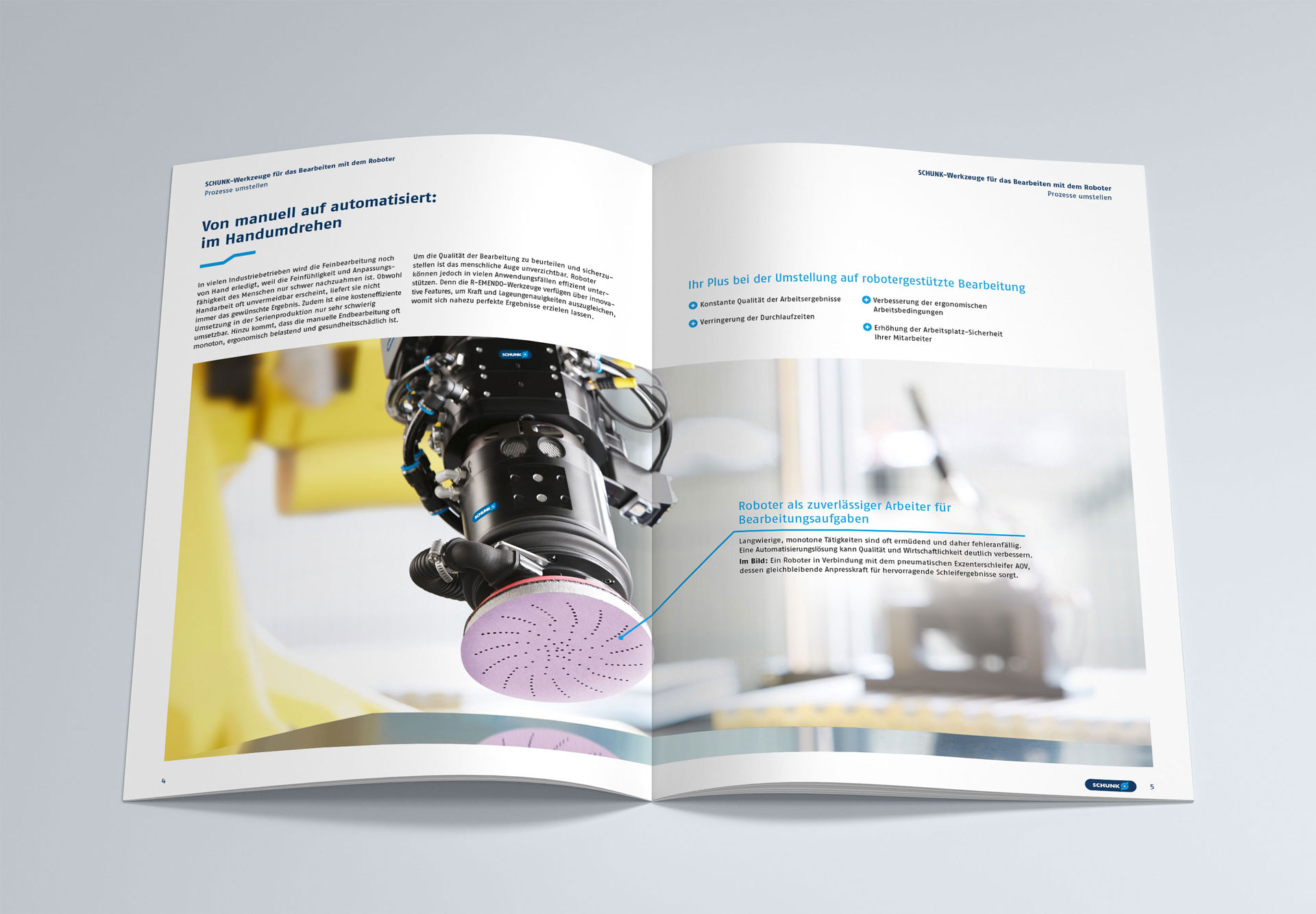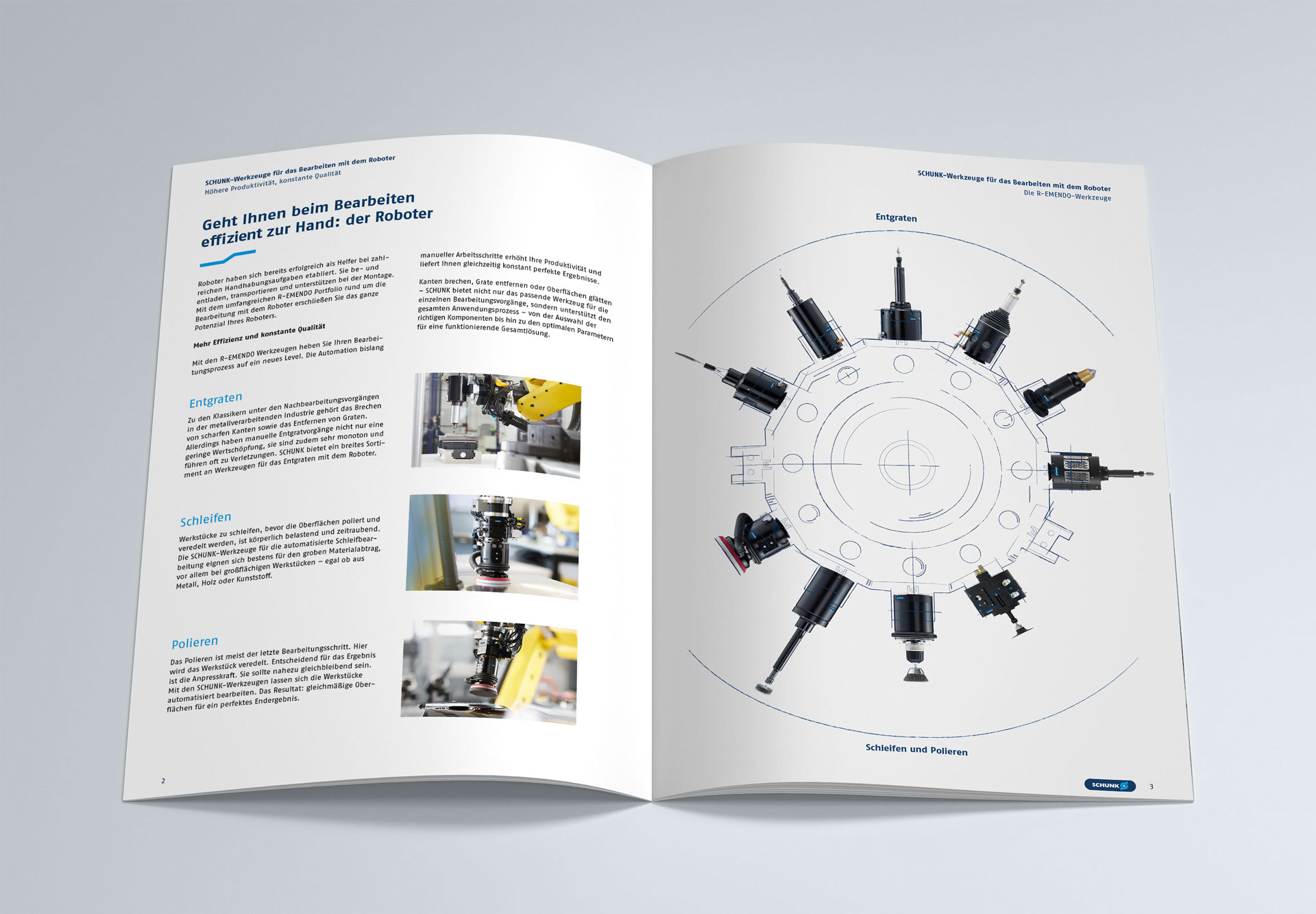 Im Rahmen eines Corporate Design „Facelift“ bei SCHUNK haben wir die gestalterische Überarbeitung der halbjährlich aufgelegten Broschüre „SCHUNK-Neuheiten und Innovationen“ realisiert. Neue Designelemente, Linien, Grafiken, Icons und Tabellen bringen die technische Produktwelt in der rund 60-seitigen geprinteten Neuheiten-Präsentation in einem neuen Erscheinungsbild zusammen.
